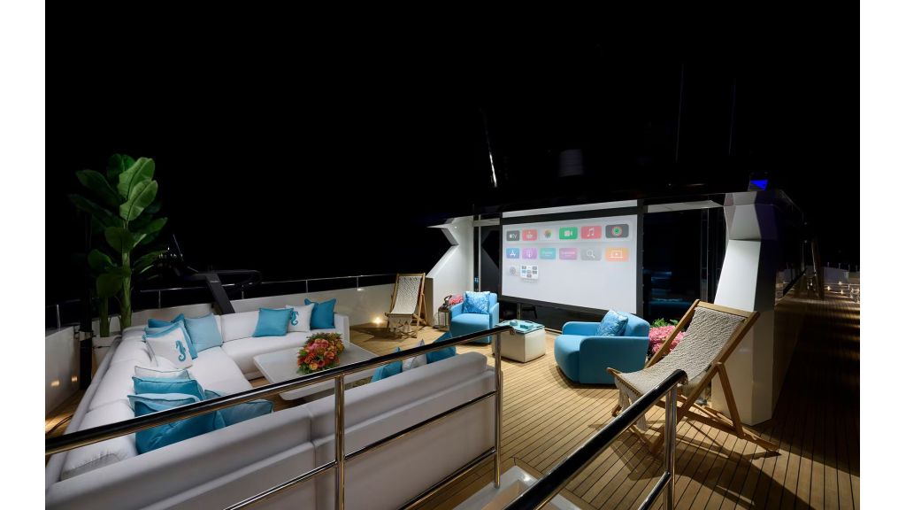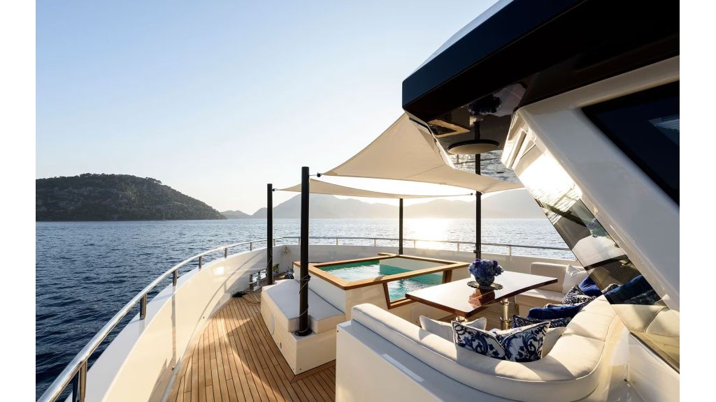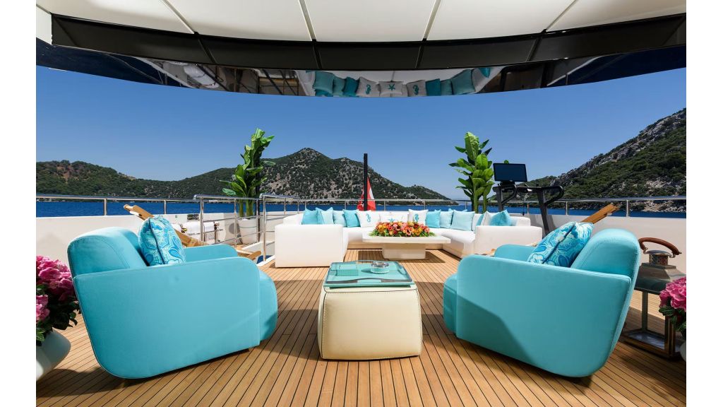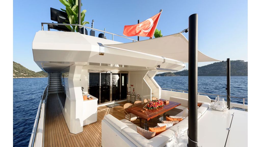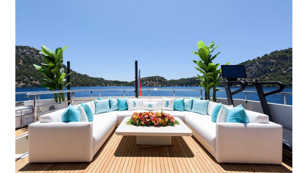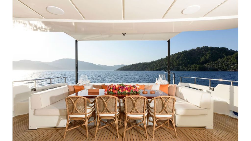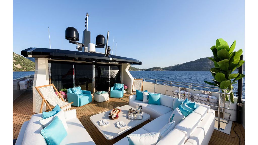 Outdoor living is a key feature of LADY LUNA. Her expansive deck areas include sunbathing zones, shaded lounges, and elegant seating areas designed for comfort and privacy. The flybridge offers panoramic sea views, ideal for sunset dining, private events, and luxury social experiences. These features directly support high-intent searches such as luxury motor yacht with flybridge and private yacht charter outdoor space.