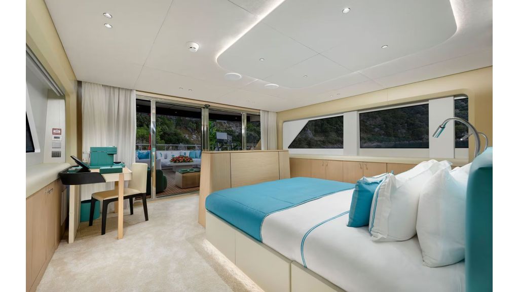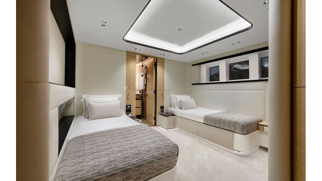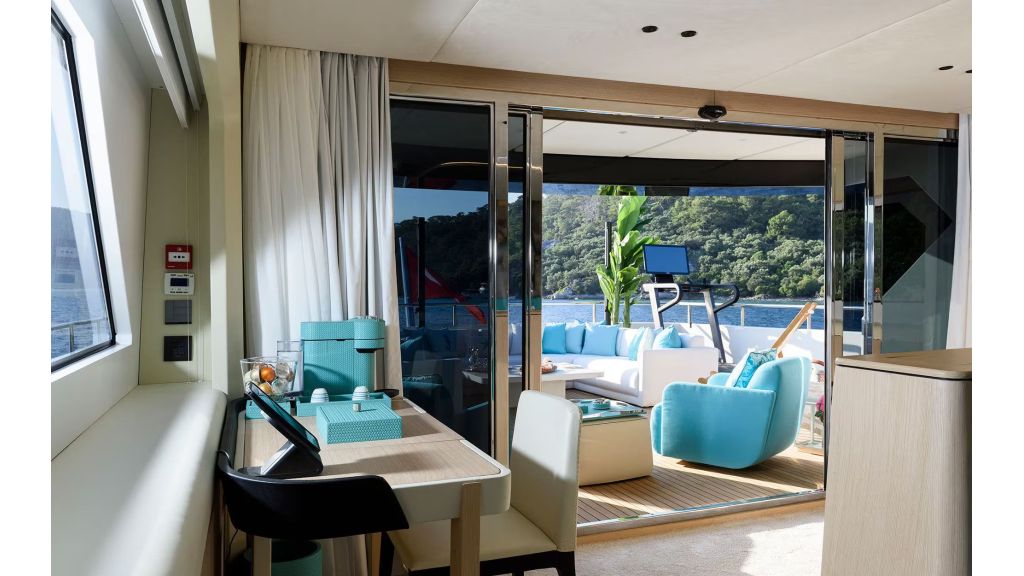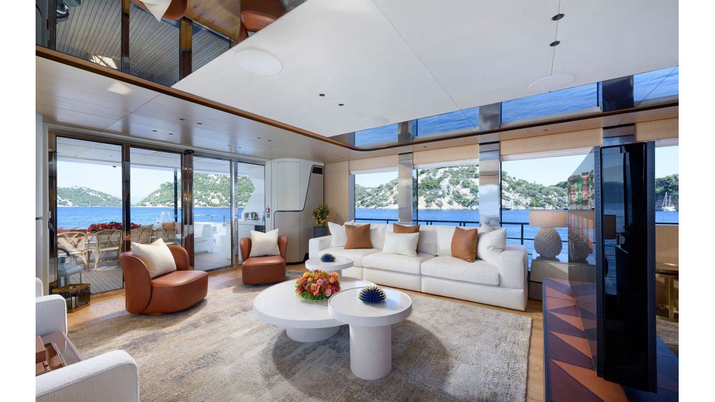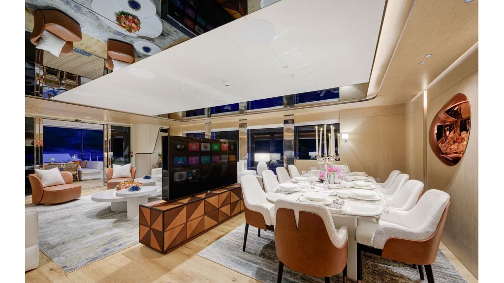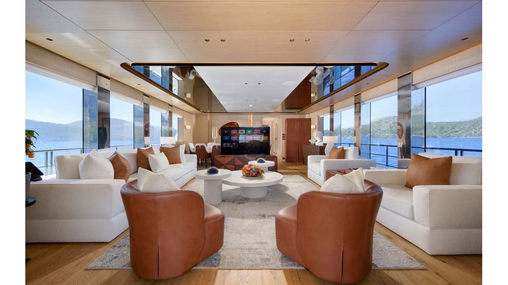 LADY LUNA offers accommodation for up to 11 charter guests across 5 luxury cabins, each equipped with en-suite bathrooms and air conditioning. The interior design reflects a refined and modern style, appealing to clients searching for luxury yacht charter with cabins, private motor yacht for families, or VIP yacht rental in Turkey. The main salon provides a spacious indoor living area ideal for dining, relaxation, and social gatherings during the charter.